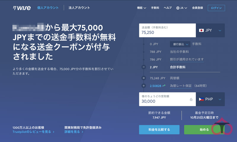 イギリスの会社ですが、フィリピンも含めた世界80ヶ国以上への送金に対応しており、何よりも送金する為のサイトが分かりやすく、使いやすいのが特徴です。